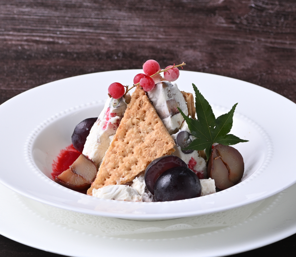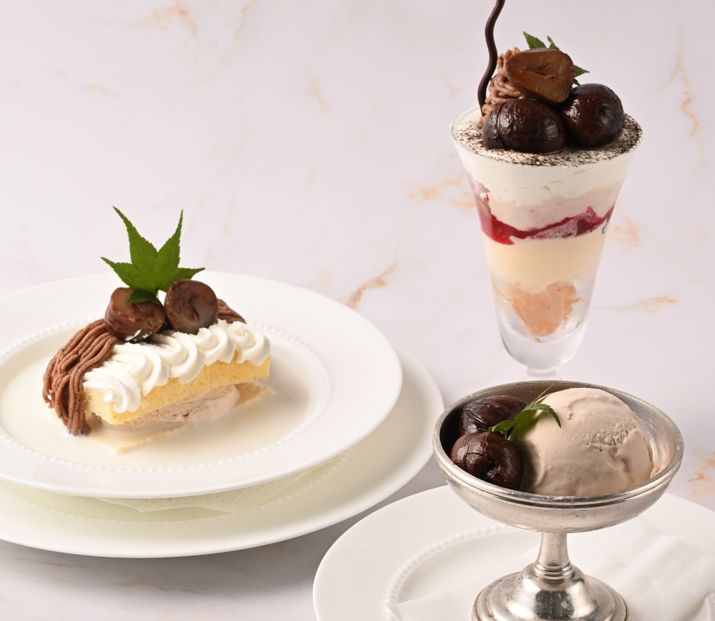 国産和栗の渋皮付き甘露煮をトップに、こっくりとした甘味のマロンクリーム、バニラ・マロンのアイスクリームを使用。ほど良い苦味のほうじ茶パウダーと甘酸っぱい木苺のソースをアクセントに、もっちりとした食感のわらび餅で最後まで様々な風味をお楽しみいただけます。