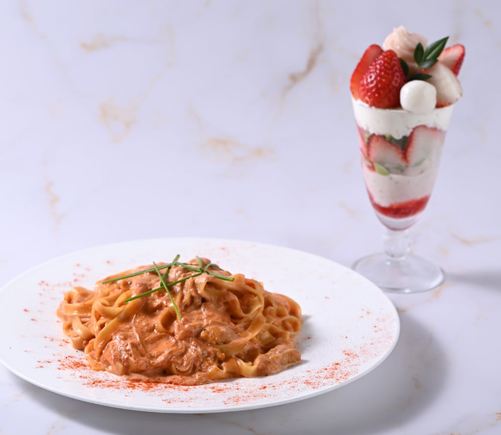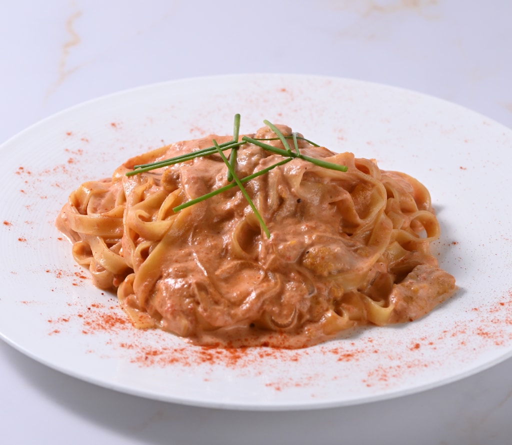 ジ甘くてとろけるような味わいのうにをトマトクリームソースで仕上げました。濃厚な旨味のうにソースをトマトの酸味が引き立てます。彩りでパプリカパウダーを添えて。