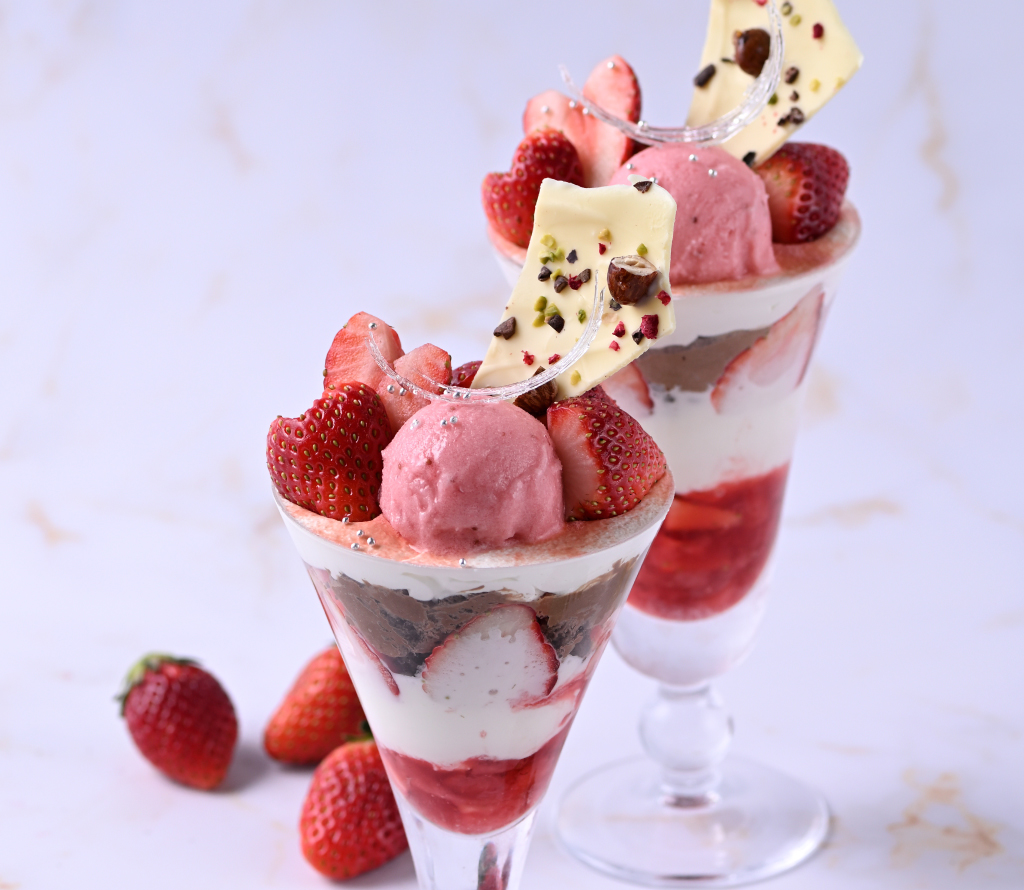 千疋屋総本店が自信を持っておすすめする苺、クイーンストロベリーを真紅に輝くティアラのように飾りたてた華やかなパフェ。グラスのなかにはクイーンストロベリーシャーベット、バニラアイスクリームが入っております。当店らしいひと品をご堪能くださいませ。